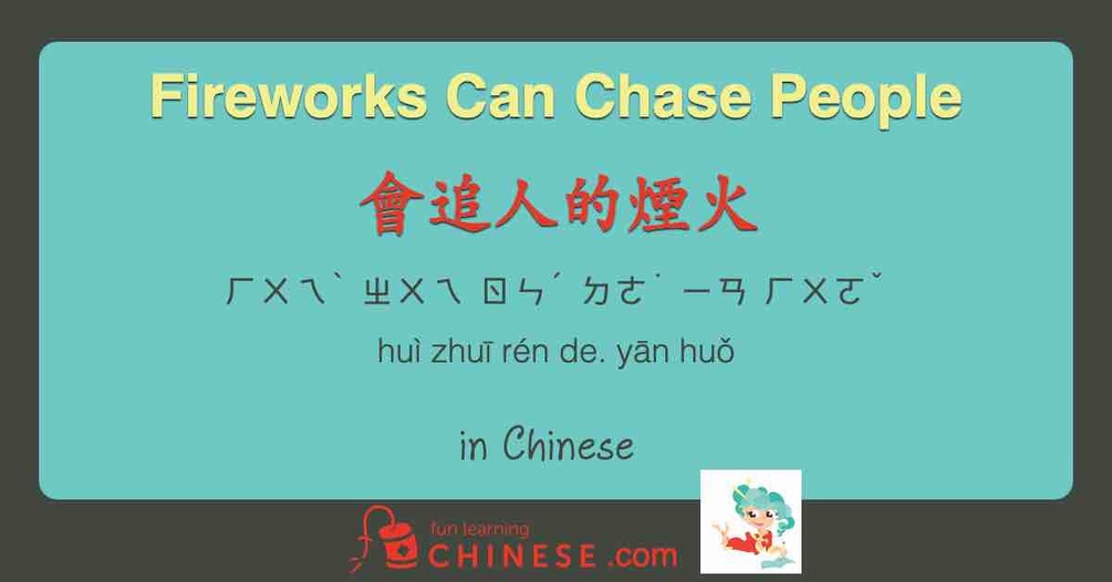 This is the completely diagrammed translation for Fireworks Can Chase People 會追人的煙火. The associated audio recording can be heard for free on the Fun Learning Chinese Podcast. The translation has both pin yin and bopomofo for pronunciation guides, as well as helpful notes that will increase understanding and make it even more fun.