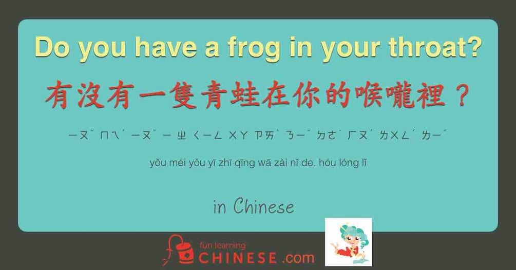 Significantly increase your Chinese comprehension with this is the completely diagrammed translation for Do you have a frog in your throat? 有沒有一隻青蛙在你的喉嚨裡?. The associated audio recording can be heard for free on the Fun Learning Chinese Podcast. The translation has both pin yin and bopomofo for pronunciation guides, as well as helpful notes that will increase understanding and make it even more fun. Don't get left behind!