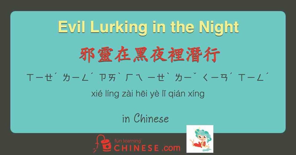 This is the completely diagrammed translation for Evil Lurking in the Night 邪靈在黑夜裡潛行. The associated audio recording can be heard for free on the Fun Learning Chinese Podcast. The translation has both pin yin and bopomofo for pronunciation guides, as well as helpful notes that will increase understanding and make it even more fun.